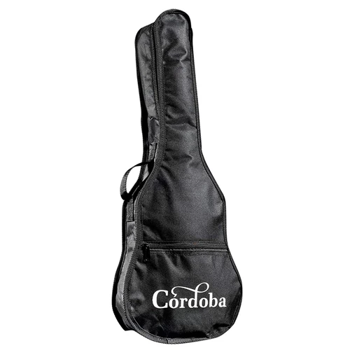 Lightly padded soft ukulele gig bag in black with two side handles, front pocket, and screen-printed white Córdoba logo.