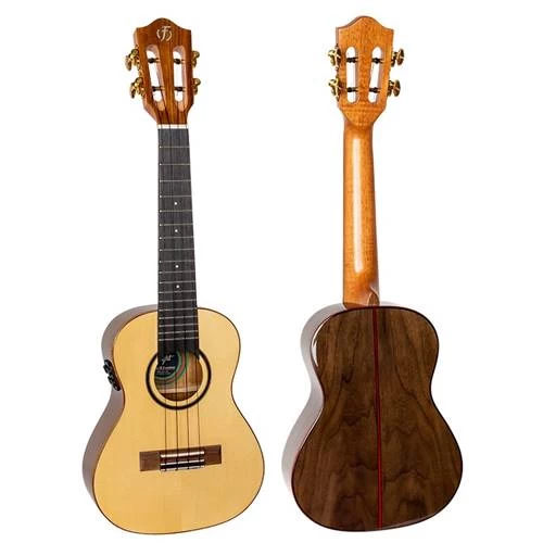 Spruce is a wood adored by ukulele players for its open projection and volume. This all-solid spruce top is paired with a lovely laminate walnut back and sides to add a warmer look and a sound similar to rosewood. The pairing of the two woods provides a deep tone and an impressive resonance. Just when you thought it couldn’t get more heavenly with the gorgeous contrast of the two woods, the gloss finish makes this ukulele a real head-tuner.