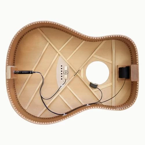 At the heart of the Anthem is a revolutionary microphone engineered to capture a dynamic studio-mic’d sound for any live performance. The TRU•MIC mounts to the underside of the bridge plate and hovers just 3 mm above its surface to take advantage of the PZM or “boundary” effect. This proprietary mounting system, combined with noise cancellation, frees the mic to perform as if it were outside of the guitar in a studio and maintain remarkable feedback suppression for the stage. The result is a balanced frequency response with excellent clarity for the purest sound you have ever heard amplified. We have paired the Element pickup with the TRU•MIC to provide solidity and punch for low frequencies.